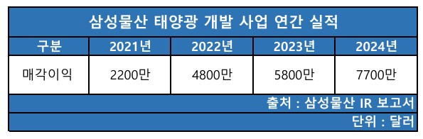 태양광 사업 확대는 매각이익이 빠르게 증가하고 있기 때문이다. 여기서 매각이익은 삼성물산이 직접 개발한 태양광 발전소 프로젝트를 다른 투자자에게 넘기면서 얻는 차익을 뜻한다. 2021년 2200만 달러(약 306억 원)에 불과했던 태양광 매각이익은 지난해 말 7700만 달러(약 1074억 원)로 세 배 넘게 뛰었다.
