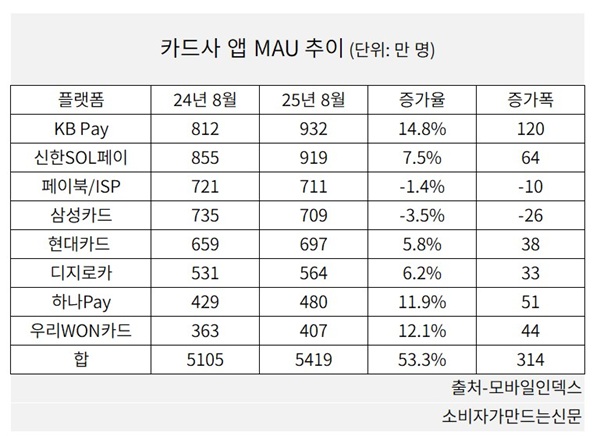26일 모바일인덱스에 따르면 지난 8월 전업 카드사 8곳의 MAU는 5419만 명으로 전년 동기 대비 314만 명 순증했다. 지난 7월 21일부터 시행한 민생회복 소비쿠폰 영향으로 8개 카드사 중 6곳의 MAU가 증가한 영향이다.