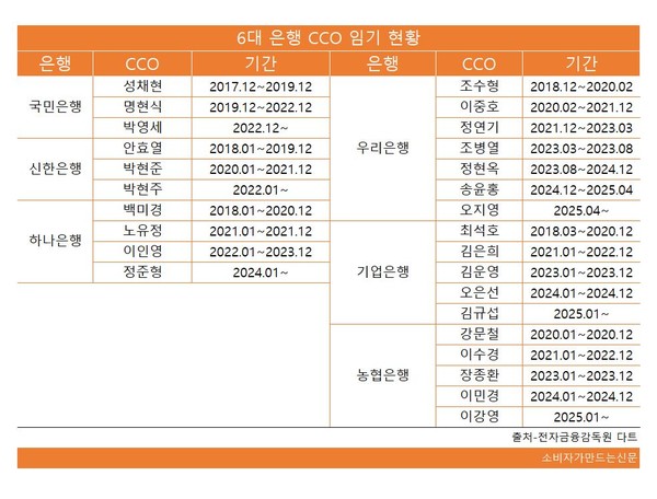 26일 소비자가만드는신문이 최근 5년(2019~2024년)간 6대 은행 CCO 임기를 살펴본 결과 2년 임기를 유지한 은행은 KB국민은행(행장 이환주), 신한은행(행장 정상혁), 하나은행(행장 이호성) 정도에 불과했다.