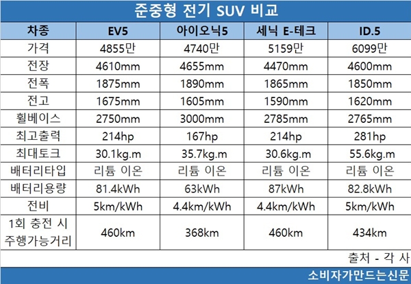 국산차, 수입차 브랜드 모두 준중형 전기 SUV를 선보이는 가운데 기아 ‘EV5’, 현대차 ‘아이오닉5’, 르노 ‘세닉 E-테크’, 폭스바겐 ‘ID.5’의 특징을 살펴봤다. 준중형 SUV는 소형과 중형차 사이의 차급으로 전장 4300mm~4700mm, 전폭 1700mm~1850mm에 해당하는 차량이다. 스펙 기준은 기본 트림으로 비교했다.