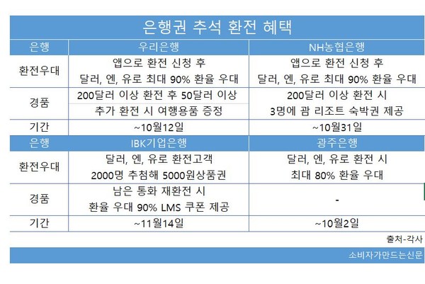 지방은행도 추석 환전 혜택 제공에 동참했다. 광주은행은 달러, 엔, 유로를 환전한 개인, 법인 고객에 최대 80% 환율 우대한다. 단 기간이 다음 달 2일까지로 짧고 한도도 달러 1000달러, 10만 엔, 1000유로까지다.