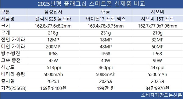 ‘갤럭시S25 울트라’는 가장 높은 해상도와 후면 카메라 화질을 갖췄으며 ‘아이폰17 프로 맥스’는 커다란 화면 크기, ‘샤오미 15T 프로’는 얇은 두께와 가벼운 무게를 앞세워 차별화를 꾀했다.