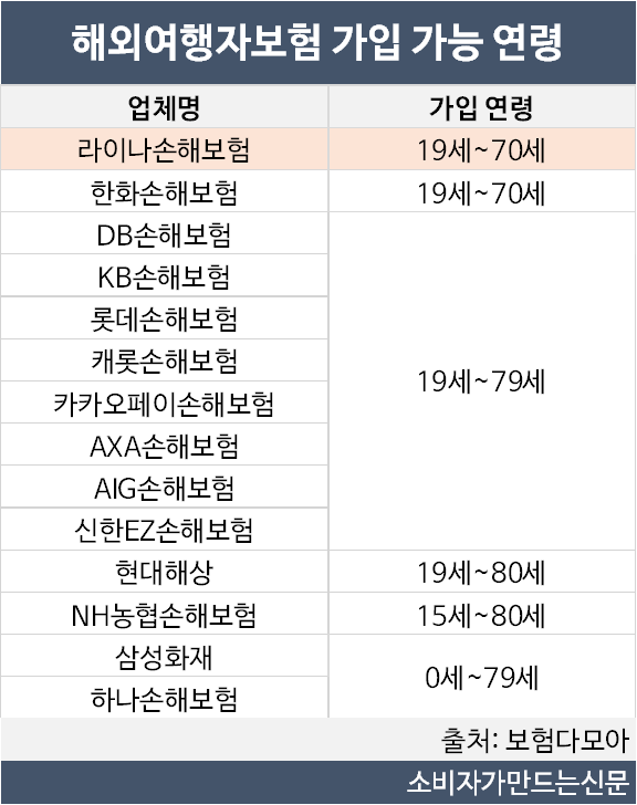 △DB손해보험 △KB손해보험 △롯데손해보험 △캐롯손해보험 △카카오페이손해보험 △AXA손해보험 △AIG손해보험 △신한EZ손해보험 등 8개사는 19세부터 79세까지 가입할 수 있는 해외여행자보험을 판매하고 있다.