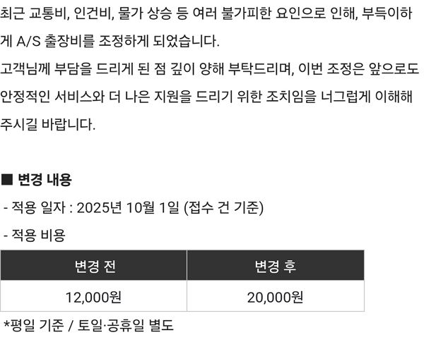 이어 "이번 출장비 가격 조정은 앞으로도 안정적인 서비스와 더 나은 지원을 위한 조치임을 이해해달라"고 덧붙였다.