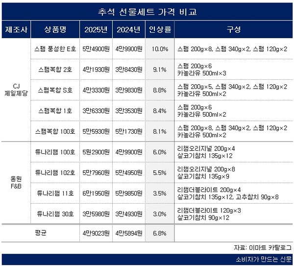 식용유와 스팸이 함께 구성된 '스팸복합 2호'도 4만1930원으로 전년대비 9.1%가 올랐다.