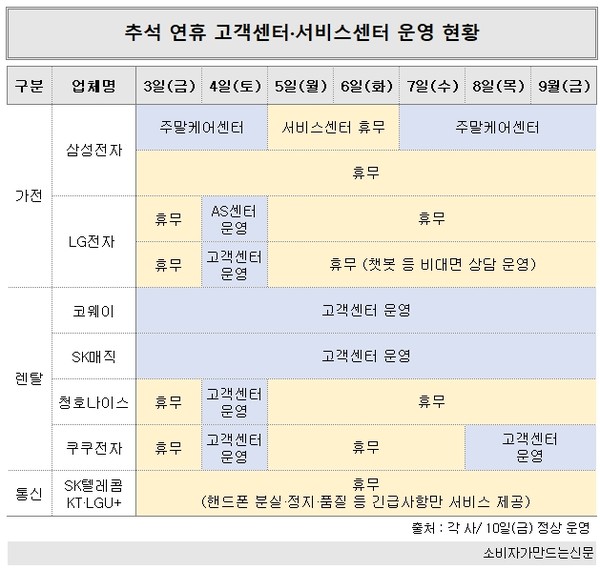 LG전자는 연휴 기간 중 토요일인 4일 오전에만 고객센터와 서비스센터를 운영한다. 휴무로 인한 불편을 줄이기 위해 연휴 내내 챗봇 등을 통한 비대면 상담은 가능하다. 안전 등 긴급 상황에 대해서는 평소와 동일하게 24시간 유인 상담과 수리 출장 서비스를 제공한다.