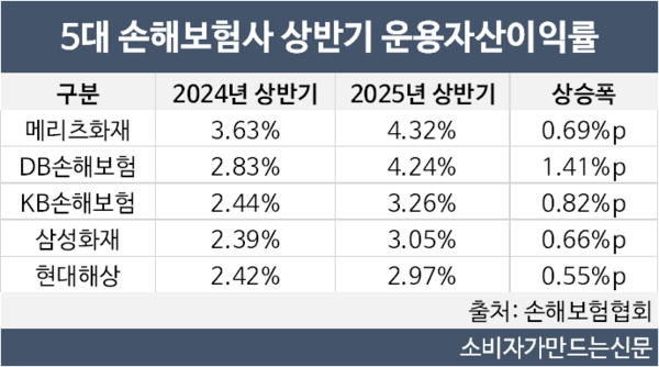 2일 손해보험협회에 따르면 상반기 자산규모순 5대 손해보험사의 운용자산이익률은 2.97~4.32%로 5개사 모두 전년 동기 대비 올랐다.