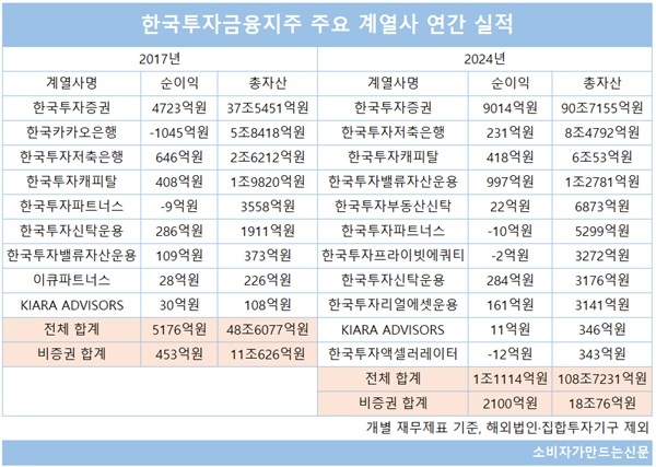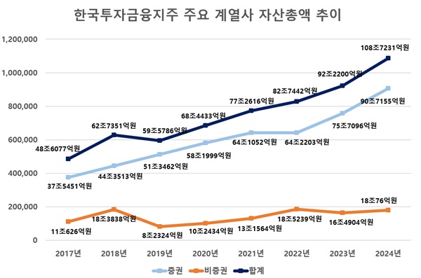 한국투자금융지주(이하 한국금융지주)는 한국투자증권을 중심으로 자산 성장을 이뤄갔다. 개별 재무제표 기준 지난 2017년 한투금융의 총자산은 48조677억 원이었지만 7년이 지난 2024년 기준 108조7231억 원으로 약 2.3배 늘었다.