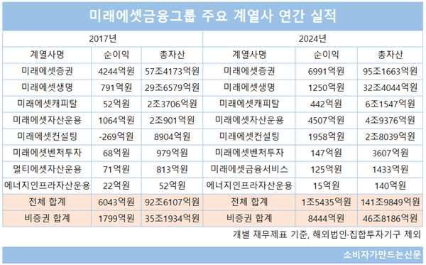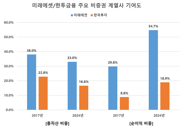 다만 미래에셋자산운용과 미래에셋컨설팅 등 일부 계열사 자산이 증가하면서 전체 비증권 계열사 자산은 2017년 35조1934억 원에서 2024년 46조8186억 원으로 약 11조7000억 원 늘었다. 비증권 부문 자산 비중도 38%에서 33%로 5%포인트 하락했지만 여전히 증권/비증권 비중이 2대1을 유지하고 있다.