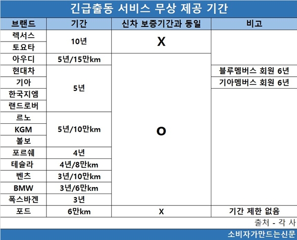 △현대차 △기아 △르노코리아 △KGM △한국지엠 등 국산차 업체들은 신차 보증기간과 동일하게 5년간 긴급출동 서비스 무상 기간을 적용하고 있다.