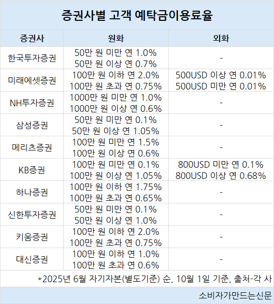 KB증권도 외화 예탁금 이용료율이 평잔 800달러 미만 구간에서는 0.1%, 그 외의 구간에서는 0.68%였다. 반면 원화 예탁금이용료율은 평잔 100만 원 미만 구간에서는 0.1%, 그 외 구간은 1.05%였다.