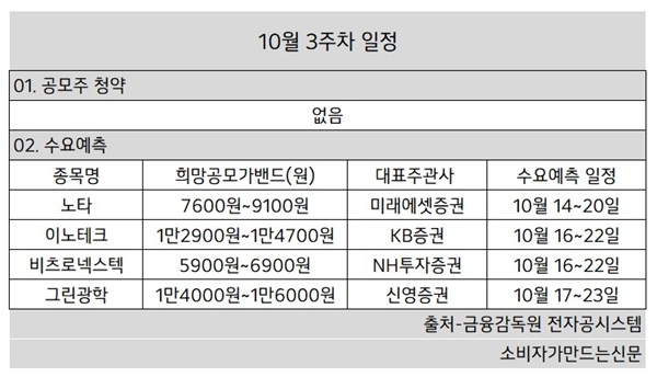 산업용 시험장비기업인 이노테크는 10월 16일부터 22일까지 수요예측을 진행한다. 희망공모가는 1만2900원~1만4700원이며 공모가액 확정은 10월 24일이다. 대표주관사는 KB증권이다.
