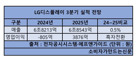 13일 금융정보업체 에프앤가이드에 따르면 LG디스플레이는 3분기 매출 6조8543억 원, 영업이익 3876억 원의 실적을 기록할 전망이다. 전년 동기 대비 매출은 전년 수준과 동일하지만 영업이익은 805억 원 적자에서 3800억 원 이상의 흑자를 기록할 것으로 보인다.