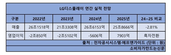 LG디스플레이의 올해 연간 영업이익 전망치는 7903억 원이다. 영업수지는 1조3500억 원가량 개선된다. 2022년부터 지난해까지 3년 연속 적자에서 벗어나는 것이라 의미가 더욱 크다.