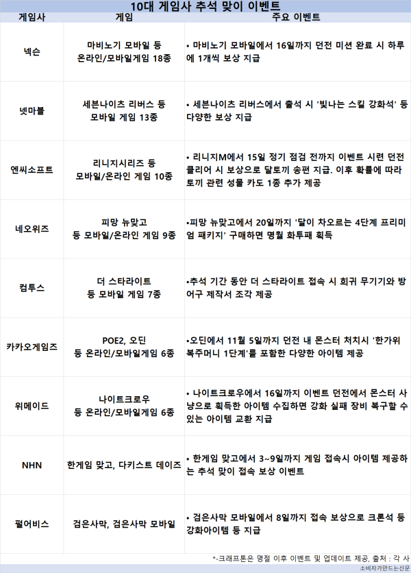 ▲마비노기는 이달 5일부터 7일까지 매일 1회 접속하면 '함께 보내는 추석 송편 선택 상자'를 지급한다. ▲마비노기 모바일은 지난 2일부터 16일 점검 전까지 '풍성한 추석 이벤트'를 진행하며 거대한 달을 인게임 던바튼 광장에 설치한다. 유저가 던전 또는 사냥터 미션을 완료하면 '알쏭달쏭 보름달 상자'를 하루에 1개씩 받을 수 있다. 누적 플레이 시간, 출석 퀘스트, 추석 온타임 이벤트 등으로도 획득할 수 있다. ▲메이플스토리M은 9일까지 윷놀이 완주 횟수에 따라 '뱀탕', '자동전투 충전권(30분)', '에루의 한가위 선물 상자' 등을 지급한다.
