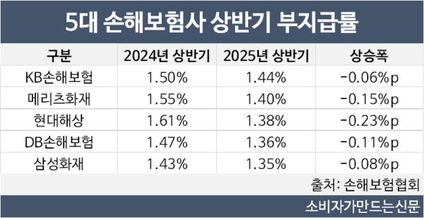 5대 손보사 중 부지급률이 가장 높은 곳은 KB손해보험이다. 올해 상반기 KB손해보험의 부지급률은 1.44%로 전년 동기 대비 0.06%포인트 떨어졌다.