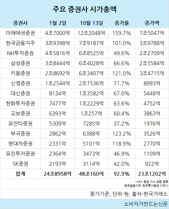 KRX 증권 지수를 구성하는 14개 증권주 중에서 시가총액과 올해 시가총액 증가율, 증가폭 모두 1위다.