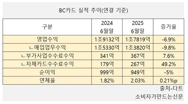 올해는 상반기까지 수익성이 소폭 악화되며 실적 개선이 당면 과제로 떠오르고 있다. 올해 상반기 BC카드의 당기순이익은 전년 대비 5% 감소한 949억 원을 기록했다. 대표적인 건전성 지표인 연체율도 같은 기간 0.21%포인트 상승한 2.03%에 달했다.