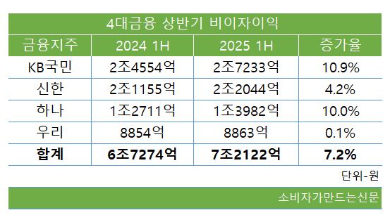 비이자이익 성장세도 빠르다. 상반기 4대 금융의 비이자이익은 7조2122억 원으로 전년 동기 6조7274억 원보다 7.2% 증가했다. 비이자이익이 0.1% 성장에 그친 우리금융지주를 제외하면 전반적으로 비이자이익이 의미 있는 수준으로 증가했다.