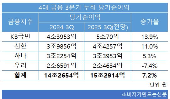 16일 금융정보업체 에프엔가이드에 따르면 4대 금융지주의 3분기까지 예상 누적 순이익은 전년 동기 대비 7.2% 증가한 15조 2914억 원에 달했다. 3분기 누적 기준으로 역대 최고치다.