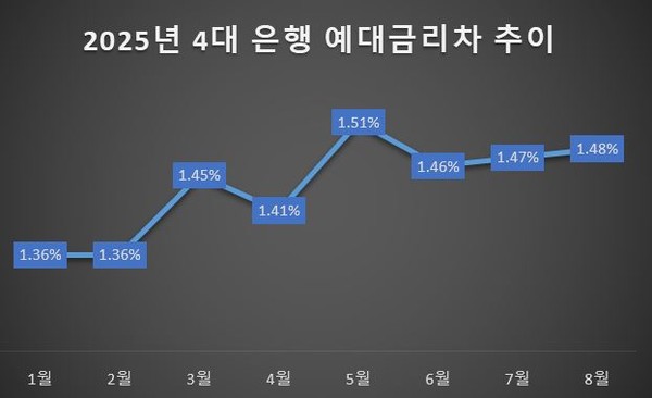가장 최근 수치인 지난 8월 기준 4대 시중은행의 평균 예대금리차는 1.48%로 올해 1월 1.36%보다 0.12%포인트 높은 상황이다. 지난 6월부터 3개월 연속 0.01%포인트씩 상승 중이다.