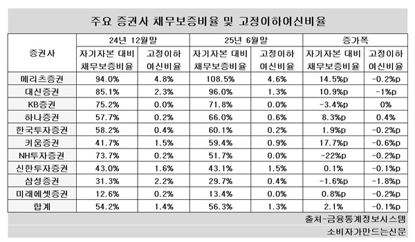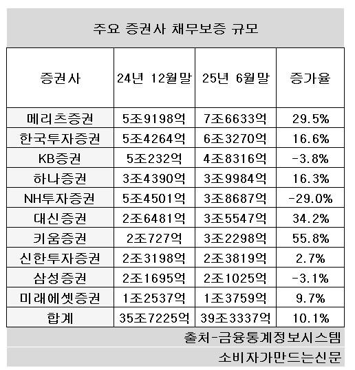 증권사 별로는 메리츠증권이 6월 말 기준 채무보증규모가 7조6633억 원으로 올 들어서만 29.5% 증가했다. 증가액도 1조7435억 원으로 증권사 중에 가장 많다.