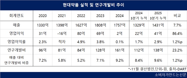 20일 전자공시시스템에 따르면 11월 결산 법인인 현대약품의 3분기(6~8월) 매출은 1431억 원으로 전년 동기 대비 7.7% 증가했다. 영업이익도 41억 원으로 86.4% 증가했다.