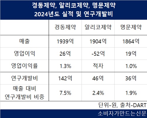 1000억 원대 후반으로 비슷한 매출 규모를 가진 명문제약, 알리코제약과 비교하면 매출 대비 연구개발비 비중은 현대약품이 최대 5배 높다.