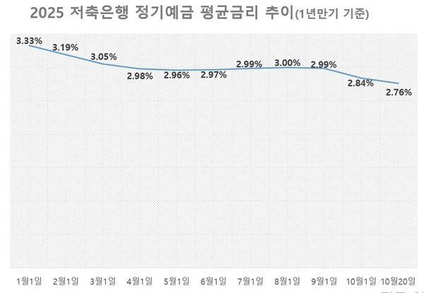 21일 저축은행중앙회에 따르면 20일 기준으로 79개 저축은행들의 정기예금 평균금리는 연초 대비 0.57%포인트 하락한 2.76%를 기록했다.