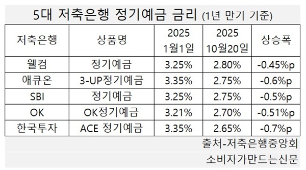 SBI저축은행, OK저축은행, 한국투자저축은행 등 자산 상위 5대 저축은행들의 예금금리도 1년 새 1%포인트 안팎으로 하락했다.