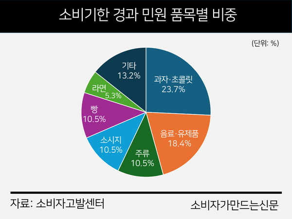 ▲주류 ▲소시지 ▲빵 종류는 각각 10.5%로 집계됐다. ▲라면은 5.3%, 달걀, 바나나 등이 포함된 ▲기타 품목은 13.2%다. 특히 삼각김밥, 김밥 등 식품은 '타임 바코드 시스템'을 통해 소비기한이 지나면 판매가 제한되지만 민원 중 7.9%는 이들 ▲즉석식품 소비기한이 지나 있었다는 내용이라 허점이 발견됐다.