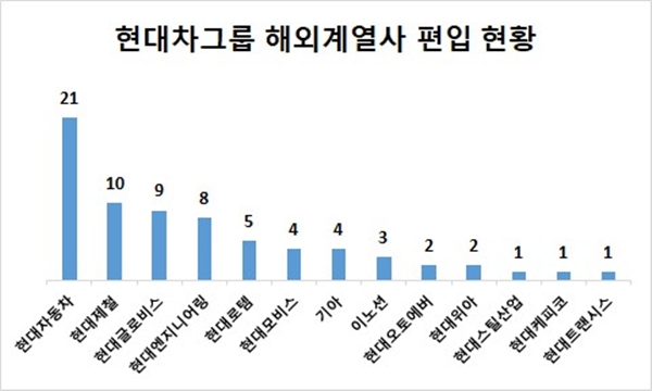 계열사별로는 현대자동차가 21개로 가장 많은 해외 계열사를 편입했다. 이어 현대제철 10개, 현대글로비스 9개, 현대엔지니어링 8개, 현대로템 5개 등의 순이다.