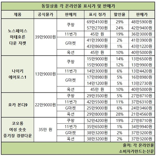 21일 소비자가만드는신문이 △코오롱스포츠 △노스페이스 △나이키 △호카 등 인기 제품을 대상으로 각 브랜드 공식몰과 주요 오픈마켓 4곳(쿠팡·G마켓·옥션·11번가)의 표시가격을 비교한 결과 할인 표시가 돼 있더라도 실제 판매가는 공식몰보다 더 비싸거나 거의 차이가 없는 경우가 적지 않았다. 제조사 권장가보다 판매 정가를 50% 가까이 올린 경우도 있었다.