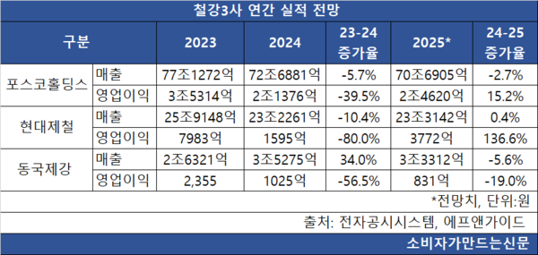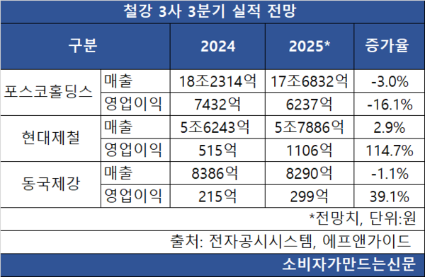 올해 상반기 영업이익이 40% 이상 감소한 것과는 달리 현대제철(대표 서강현)은 3분기 영업이익이 두 배 이상 늘고 동국제강(대표 최삼영)도 증가율이 40%에 육박할 것으로 보인다. 포스코홀딩스(대표 장인화·이주태)는 영업이익 감소폭이 3분의 1 수준으로 확 줄어든다.