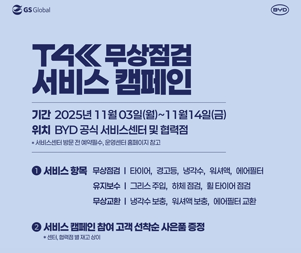 이번 무상 서비스 캠페인은 다음 달 3일부터 14일까지 전국 BYD 공식 서비스센터 및 협력점 총 32개소에서 진행된다.