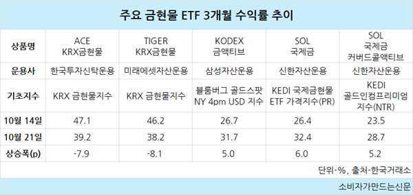 23일 한국거래소에 따르면 국내 금 가격을 추종하는 △미래에셋자산운용 TIGER KRX금현물 △한국투자신탁운용 ACE KRX금현물의 평균 3개월 수익률은 21일 기준 38.7%였다.