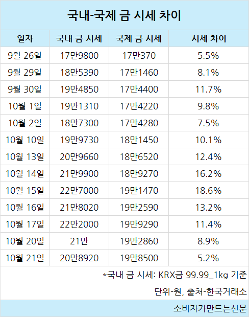 국내 금 시세와 국제 금 시세 간 격차는 9월 말 이후 급격히 차이가 커져 지난 15일에는 18.6%에 달했다. 하지만 이후 금 시세 하락과 함께 격차가 좁혀지며 21일에는 5.2%로 시세차가 13.4%포인트 좁혀졌다.