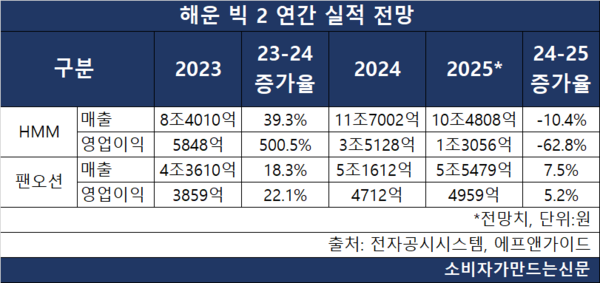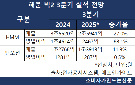 컨테이너 운임 하락이 HMM(대표 최원혁)의 수익성에 큰 부담으로 작용한 반면 팬오션(대표 김홍국·안중호)은 벌크선 중심의 안정적 운항으로 실적 방어가 예상된다.