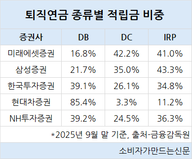 현대차증권의 올해 3분기 기준 전체 적립금 18조1389억 원 중에서 85.4%에 달하는 15조4994억 원이 DB형이다. DC형과 IRP 적립금 비중은 각각 3.3%와 11.2%에 그친다.
