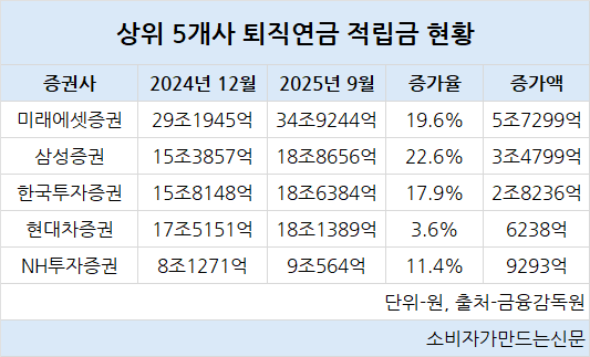 금융감독원 통합연금포털에 따르면 올해 9월 말 기준 미래에셋증권 퇴직연금 누적 적립액은 34조9244억 원으로 올 들어 19.6% 증가했다. 증가액은 5조7299억 원으로 국내 증권사 중 가장 많았다.