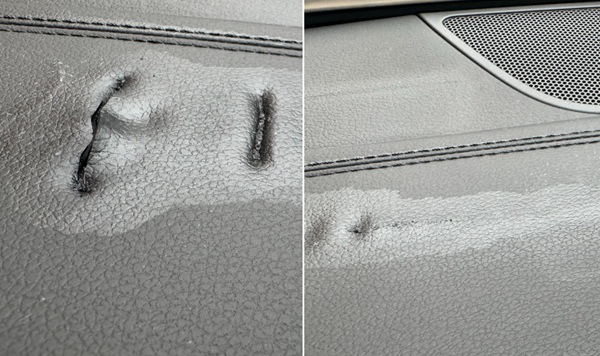 그러나 2주만에 방향제 내용물이 생각보다 빨리 줄어드는 것 같아 확인했다가 깜짝 놀랐다. 방향제를 떼어내자 용액이 새어나와 대시보드에까지 스며든 상태였다. 대시보드 가죽이 쭈글쭈글 상했고 심지어 구멍까지 뚫려 있었다.