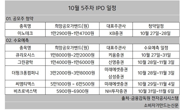 신뢰성 환경시험 장비 전문기업 이노테크는 10월 27일과 28일 이틀간 공모주 청약을 진행한다. 희망공모가는 1만2900원~1만4700원으로 24일 최종공모가가 확정된다. 대표 주관사는 KB증권이다.
