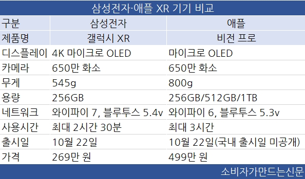 삼성전자의 '갤럭시 XR'은 256GB 용량으로 출시 가격은 269만 원이다. 애플의 '비전 프로'는 256GB 기준 499만 원으로 가격은 두 배 가까이 차이가 난다.