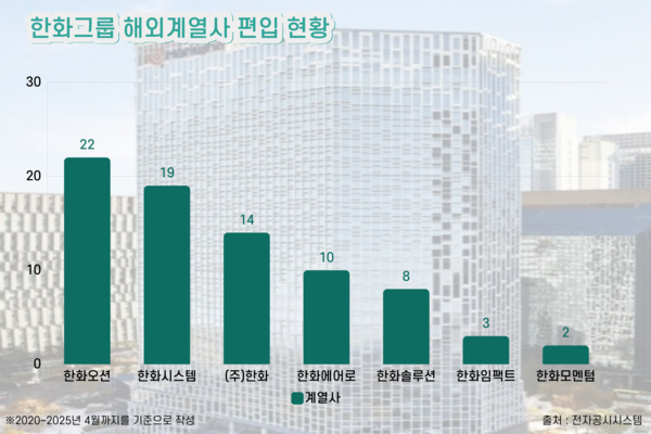 한화그룹이 2020년 이후 편입한 해외 계열사 절반 이상이 조선‧IT‧방위 산업을 영위하는 것으로 나타났다. ‘육·해·공 토탈 방산기업’의 비전 실현을 위해 이들 해외 계열사를 대거 편입했다.