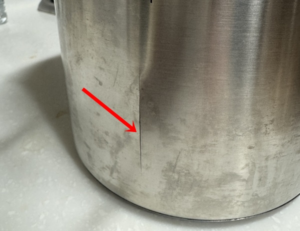 냄비에 물을 담아 옮기는데 물이 떨어져 살펴보니 냄비 옆면이 세로로 길게 갈라져 있었다. 그 틈으로 물이 줄줄 새어나오고 있었던 것.