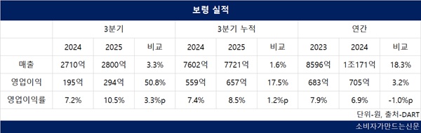 3분기만 살펴보면 매출은 2800억 원으로 3.3% 증가했고 영업이익은 294억 원으로 50.8% 늘었다. 영업이익률은 10.5%로 3.3%포인트 상승했다.