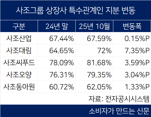 김계수 세명대학교 경영학과 교수는 "사조그룹 상장사의 특수관계인 지분 확대 움직임은 단순한 우연이라기 보다는 지배구조 재편의 포석으로 볼 여지가 있어 보인다"며 "일반적으로 지주회사 체제나 내부 통합을 추진하는 기업들은 상장 자회사들의 지분율을 높여 내부 지배력을 강화한 뒤, 상장폐지 또는 흡수합병을 검토하는 경우가 많다"고 말했다.