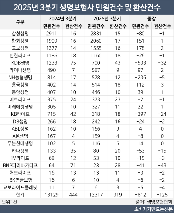 생보사, 3분기 민원건수 6.2% 줄어...KB라이프·KDB생명 절반으로 '뚝'