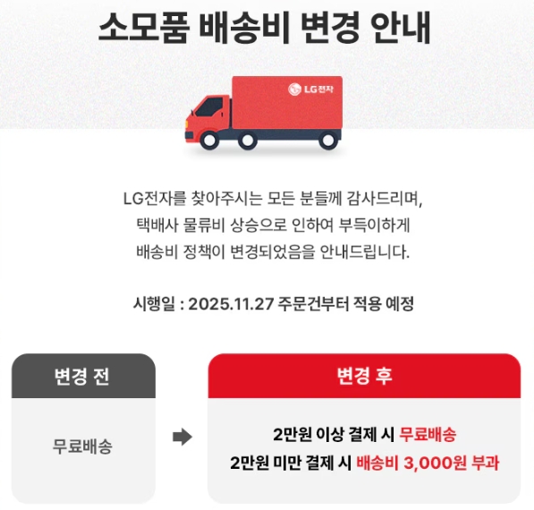 LG전자에 따르면 11월27일부터 공식 홈페이지에서 소모품 주문 시 2만 원 미만일 경우 3000원의 배송비가 부과된다. 반품 시엔 왕복 배송비 6000원이 발생할 수 있다. 2만 원 이상 결제하면 배송비가 무료다.