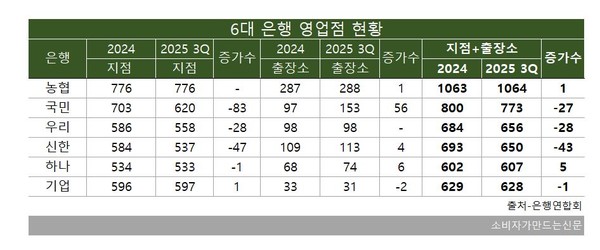 특히 6대 시중은행의 지점 수는 3779곳에서 3621곳으로 158곳이 순감소한 반면 출장소는 692곳에서 757곳으로 65곳 순증했다.